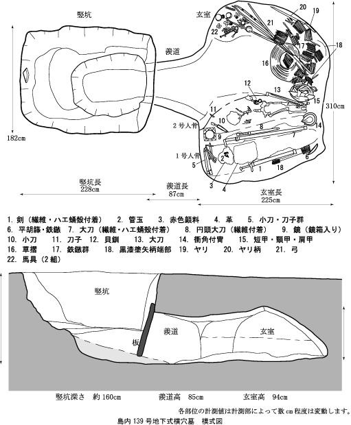 ■島内地下式横穴墓群は豊富な副葬品で知られ、
